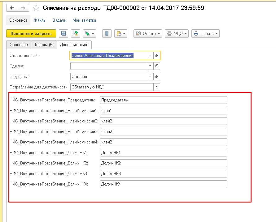 перечень товаров на уничтожение печатная форма внутреннее потребление товаров акт уничтожения списание товаров утилизация упаковка вес характеристика номенклатуры серия комиссия по списанию склад производство внутренние требования дополнительные реквизиты