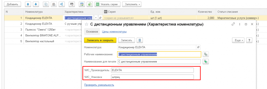 • Подтяжка доп.реквизита ЧИС_Упаковка: берет «человеческое» название упаковки из дополнительных реквизитов характеристики номенклатуры, не требуя новых полей в справочнике.
