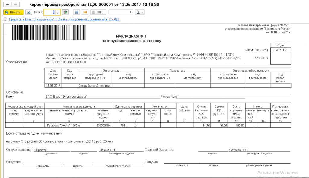 Оформляет отпуск материалов/товаров на сторону в унифицированном формате М-15, что удобно при возврате поставщику несоответствующей продукции.