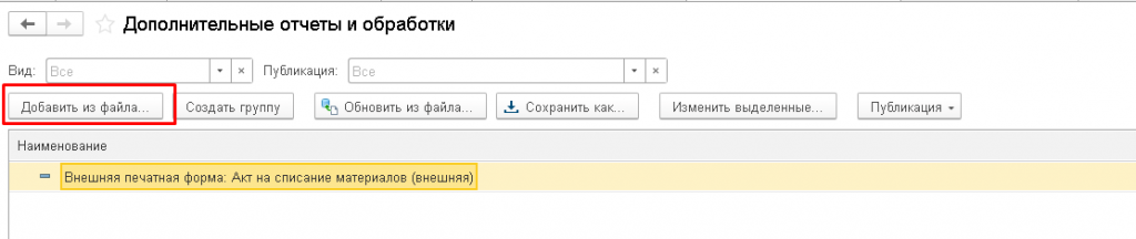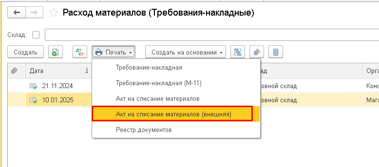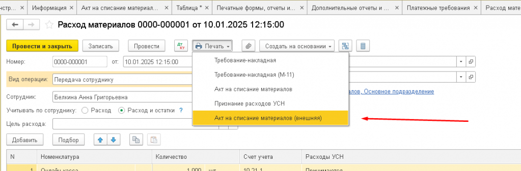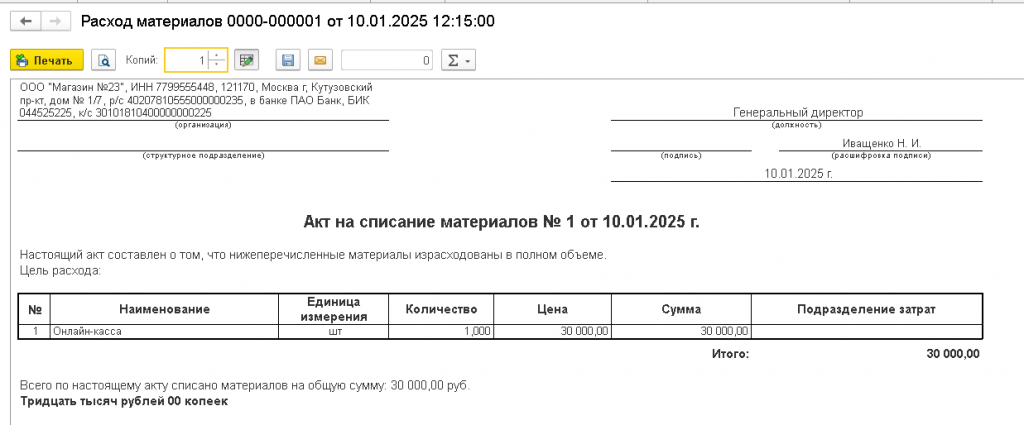 Акт на списание материалов для документа Расход материалов в 1С:Бухгалтерии 3.0
