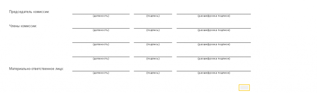 • Выводит блок с комиссией или индивидуальным предпринимателем: должности, ФИО председателя и членов комиссии, материально ответственное лицо.