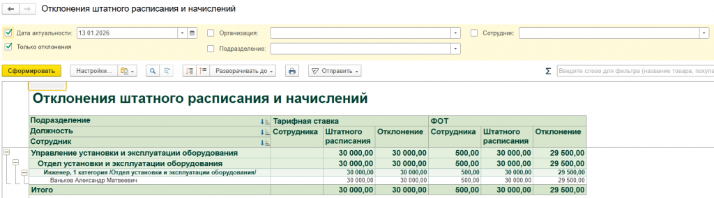 - ФОТ отклонение - ФОТ штатного расписания минус ФОТ сотрудника.