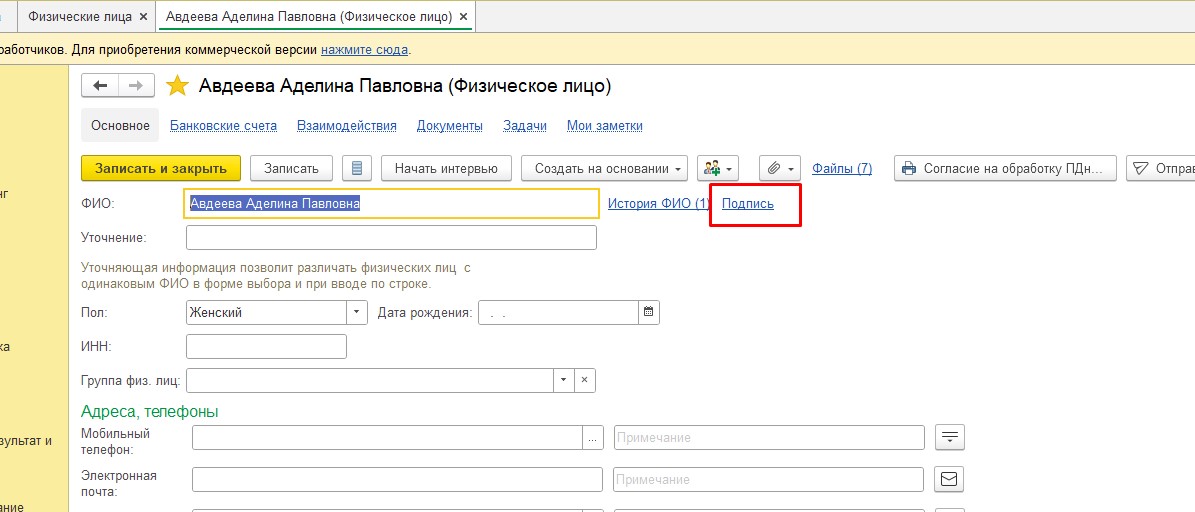 Расширение справочника «Физические лица»: В карточку каждого сотрудника или контрагента-физлица теперь добавлена возможность прикрепить файл с его факсимильной подписью (изображение в форматах JPG, PNG и др.).
