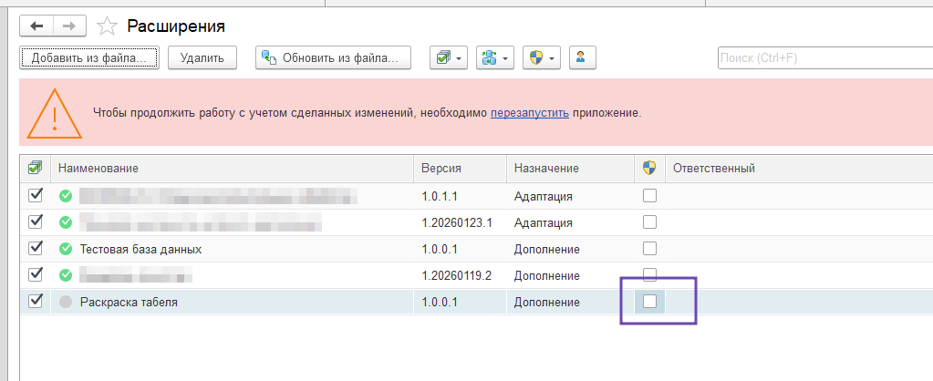 Обязательно необходимо снять галочку с безопасного режима. Это связанно с тем, что в расширении используются переопределения методов форм с типом вызова "После", для создания дополнительных реквизитов и элементов формы.