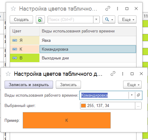 Выделение цветом Видов использования рабочего времени в форме документа Табель учета рабочего времени