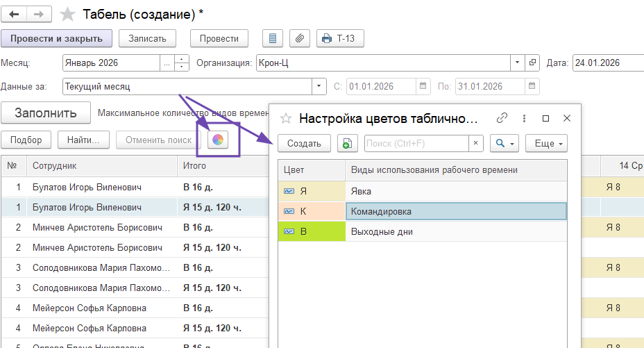 Табель Раскраска Виды времени Табель учета рабочего времени Виды учета рабочего времени