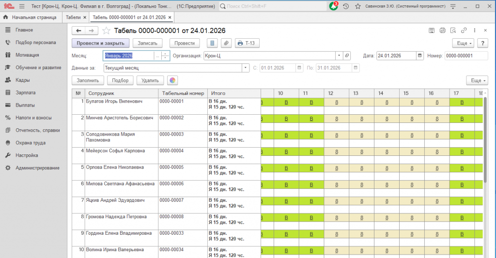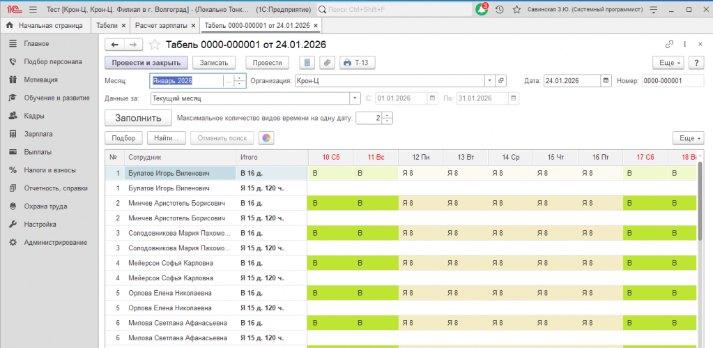 Выделение цветом Видов использования рабочего времени в форме документа Табель учета рабочего времени