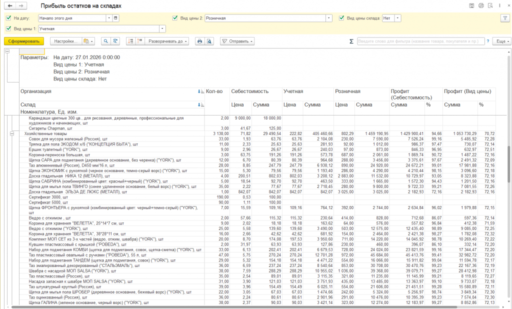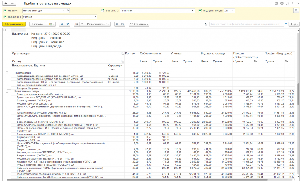 Расчет потенциальной прибыли от складских запасов на выбранную дату. Отчет анализирует текущие остатки товаров, суммовые остатки себестоимости и выбранных видов цен и на основании этих данных показывает суммовую и процентную прибыль остатков товаров на складах.