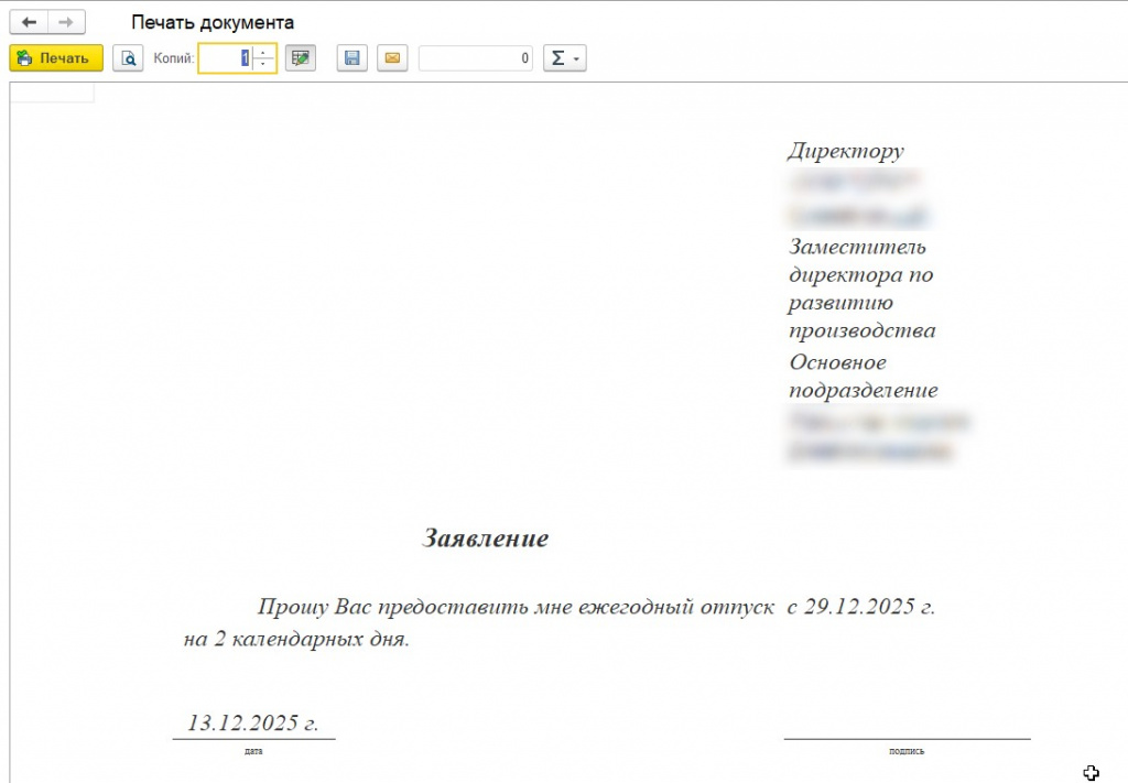 Внешняя печатная форма "Заявление на отпуск" с отладкой. Подключается к документам "Отпуск". Позволяет распечатать Заявление на отпуск.