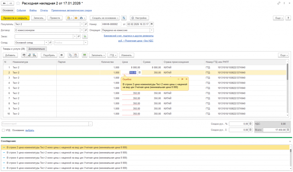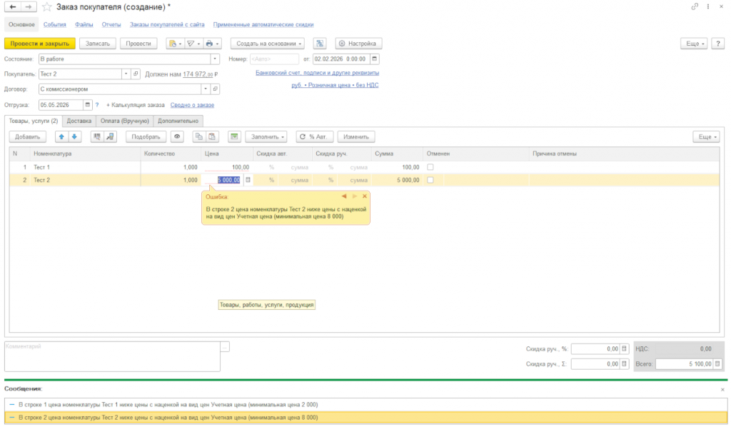 На рисунке ниже представлен заказ покупателя, в котором цена установлена ниже минимальной с наценкой. Текущий пользователь заполнен в настройке наценки на вид цены "Розничный" от "Учетной" цены. Учетная цена для номенклатуры Тест1 и Тест2 равна 2000 и 4000 соответственно, наценка равна 100%. В заказе установлена "Розничная" цена для Тест1 и Тест2 ниже 4000 и 8000 соответственно, поэтому заказ не может быть проведен. Для каждой строки выводится предупреждающее сообщение с указанием минимальной возможной цены для этого товара.