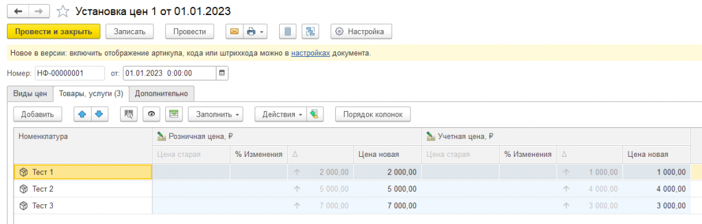 Ниже представлена установка цен для видов цен "Розничная" и "Учетная". Для номенклатуры Тест1 и Тест2 "Учетная" цена равна 1000 и 4000.