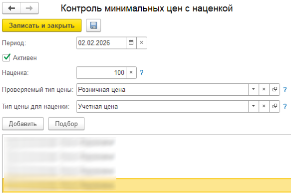 Ниже представлена форма списка контроля минимальных цен с наценкой