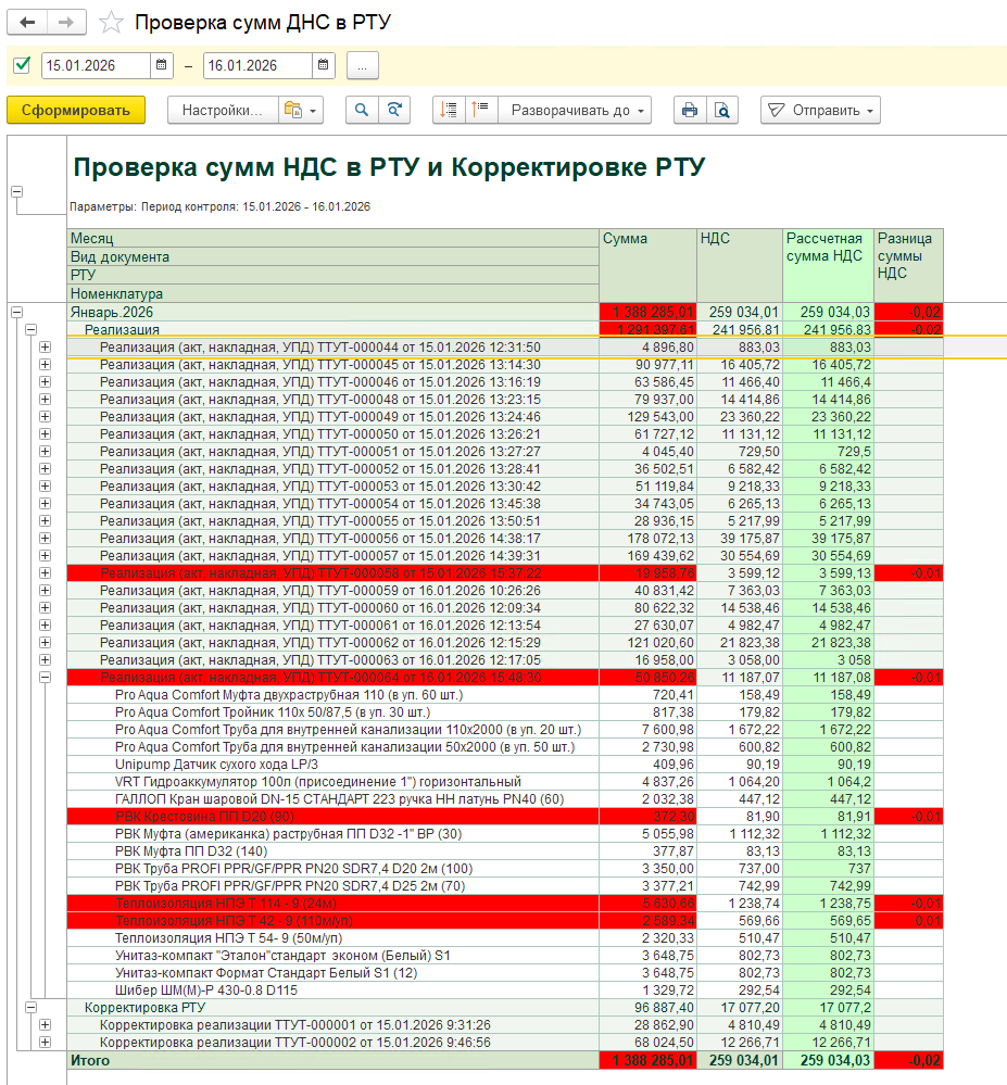 Выбирается период и за указанный период формируется отчет с группировками по месяцам, видам документам, самим документам и номенклатуре. Группировки можно настраивать как для любого отчета на СКД. Производится расчет НДС построчно с уровня номенклатуры. Далее расчетное значение сравнивается с НДС в документе.  Красным цветом выделяются строки, где НДС счетный и НДС в документе не совпадают.