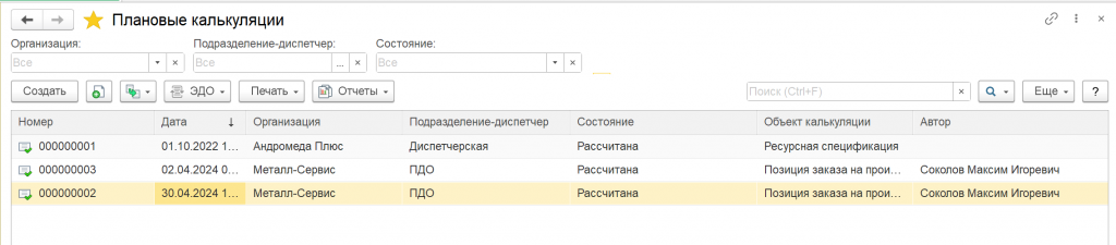 Список документов "Плановые калькуляции"
