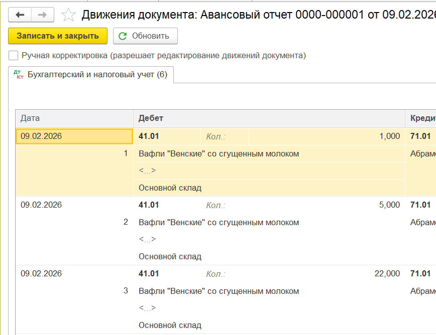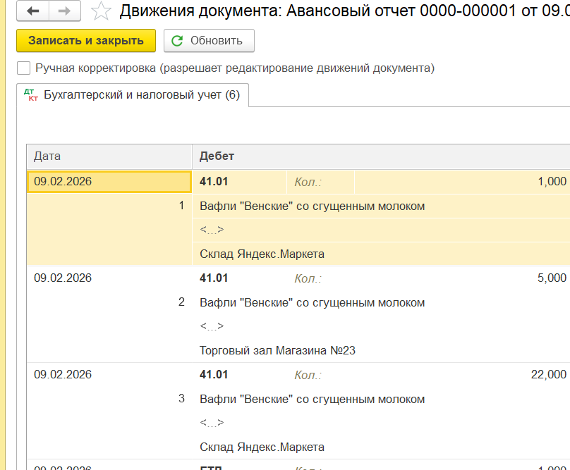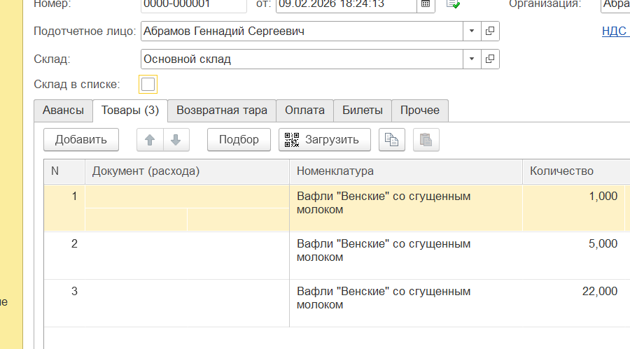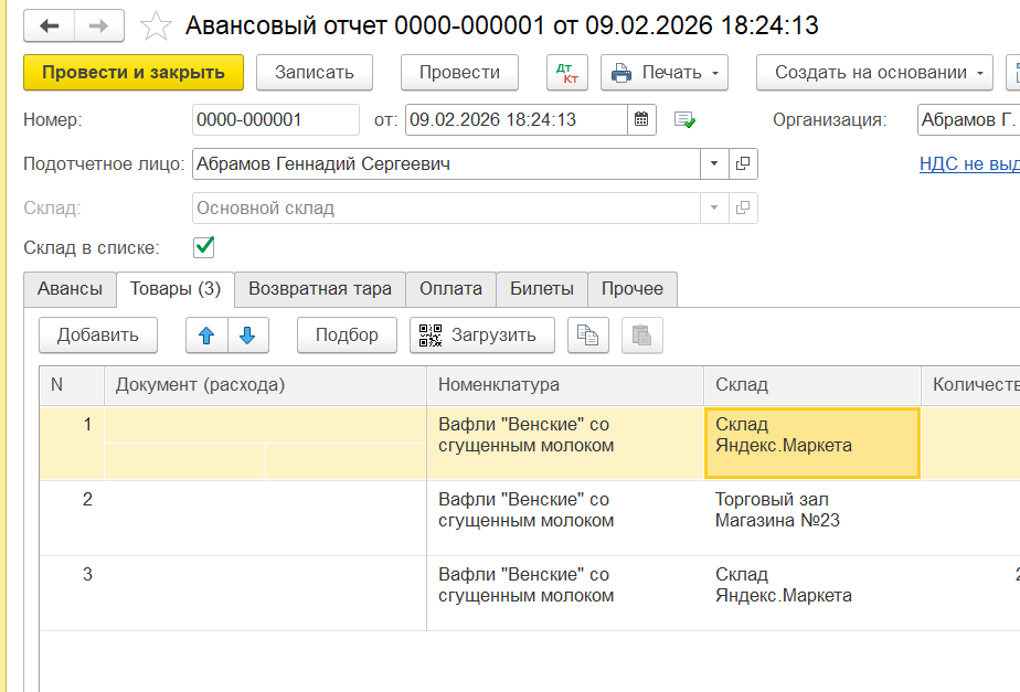 В документе Авансовый отчет реквизит склад размещен в шапке документа, таким образом сделать приход сразу по разным складам одним документов не получится. Данная доработка, через расширение, позволяет сделать приход на разные склады.
