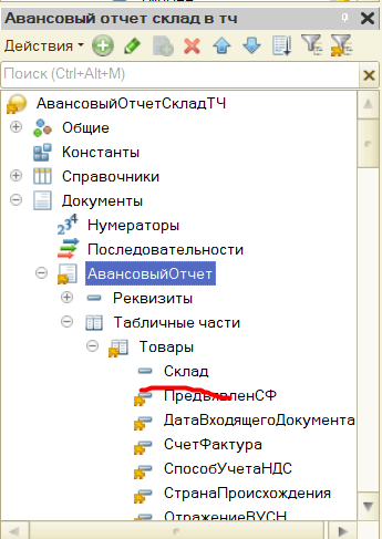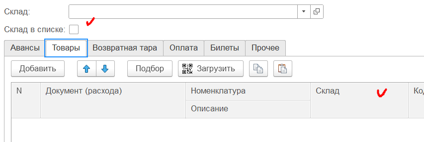 Реквизит Склад в табличной части в документе Авансовый отчет. 1С: Бухгалтерия 3.0