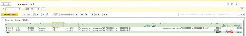 Полная видимость цикла РБП: в одной таблице — поступление, платежи, зачёты авансов и остатки, чтобы видеть, какие расходы оплачены/неоплачены.