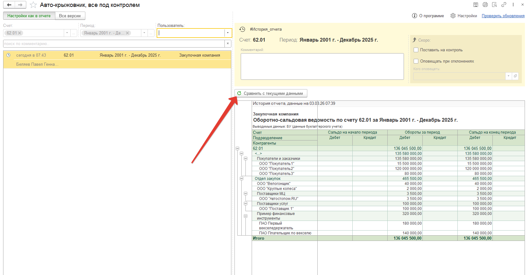 Автоматически сохраняет версии отчета "Оборотно-сальдовая ведомость по счету" при его формировании