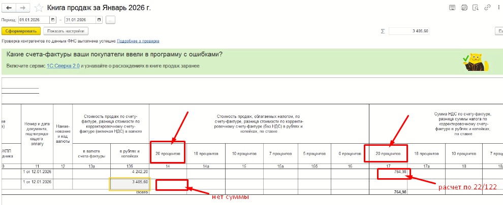 В последних релизах конфигурации "Управление торговлей" (УТ 11.5), а именно на платформе 11.5.25.103 и выше, при работе с отчетом "Книга продаж" обнаружена критическая ошибка учета. Данные по налоговой ставке 22%, которая используется с 2026 года вместо ставки 20% не попадают в отчет. Таковой графы в книге продаж просто нет. Это искажает итоговые показатели отчетности и может привести к некорректному начислению налогов.