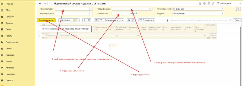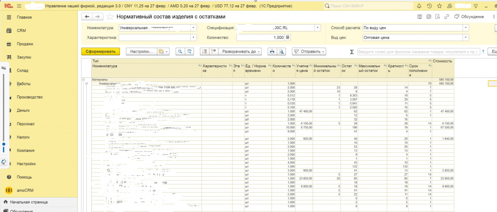 Доработанный типовой отчет "Нормативный состав изделия". Позволяет получить комплектацию спецификации с указанием количества каждой позиции и наличием на складе данных позиций.Позволяет выбрать учетный вид цены и получить стоимость состава спецификации по указанному виды цены.