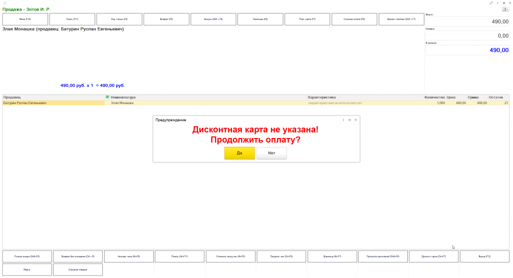 - Крупный красный текст: *«Дисконтная карта не указана! Продолжить без карты?»*