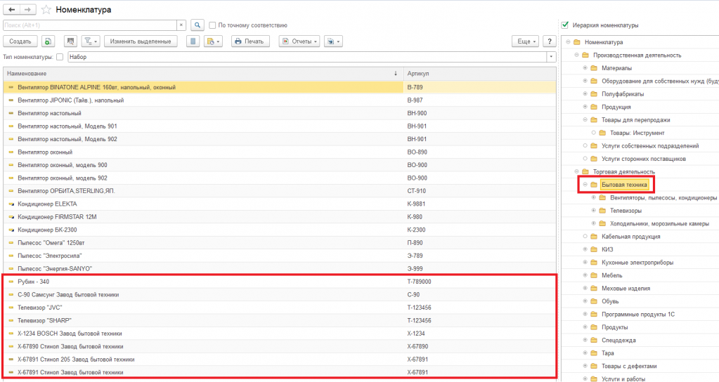 УТ11.5 Управление торговлей Иерархия номенклатуры Список номенклатуры Иерархия