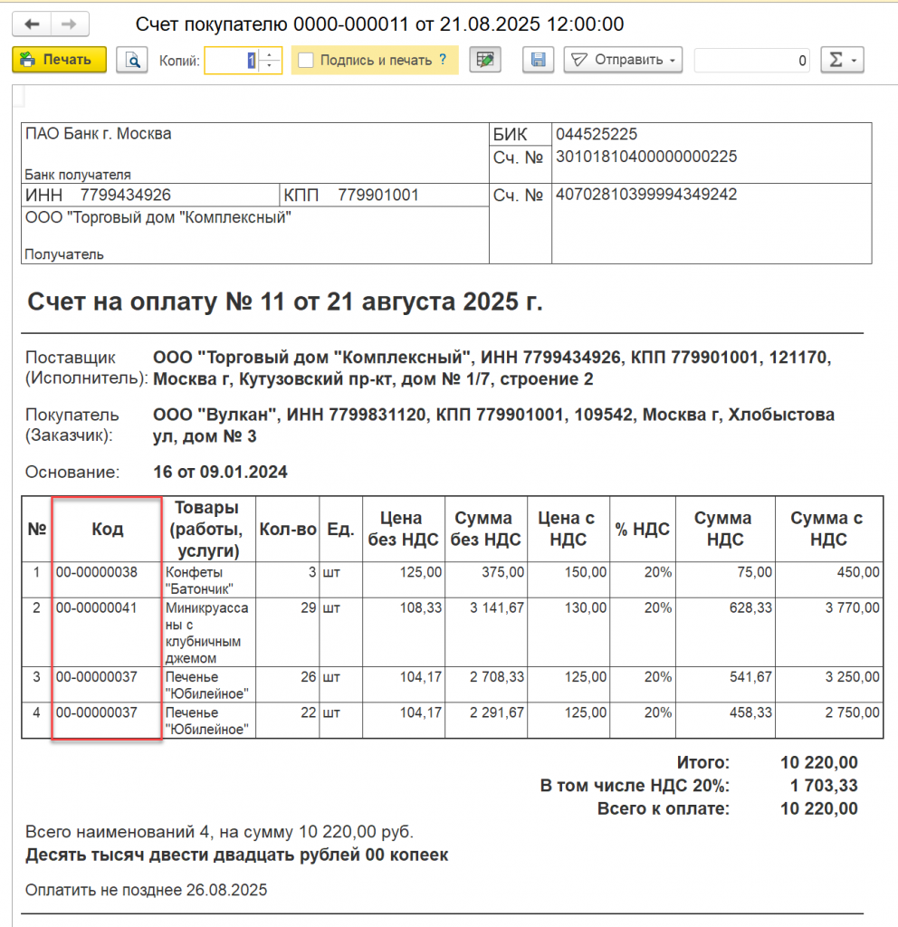 Счет на оплату покупателю с НДС (без выбора дополнительной колонки при печати)