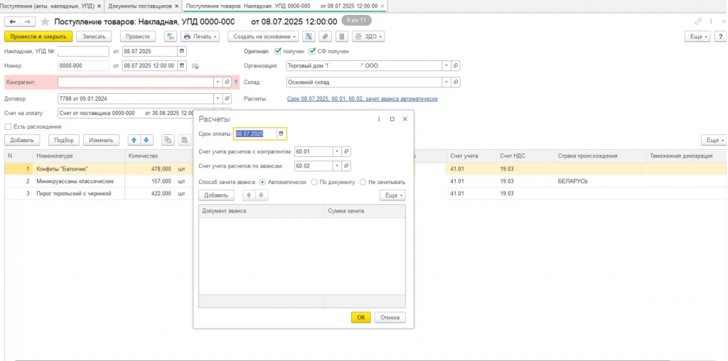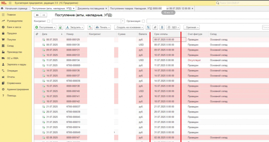 Добавление колонки "Срок оплаты" в журнале Поступление (акты, накладные, УПД)
