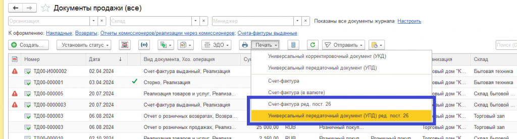 Новые формы выводится, если дата документа больше 01.04.2026. Иначе выводятся предыдущие редакции.