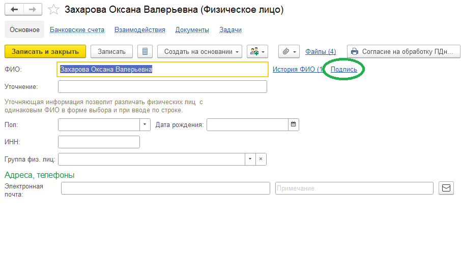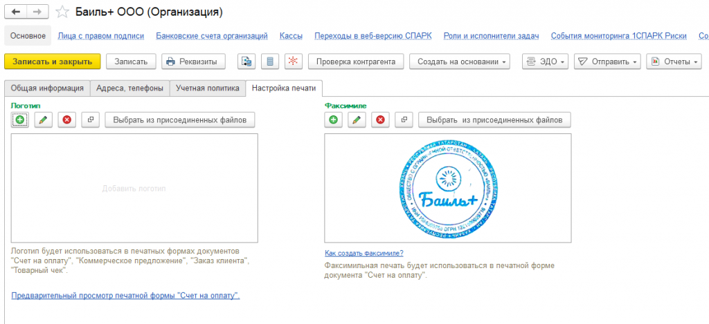 Подпись добавляется в физлице ответственного, печать в карточке организации (см изображения)