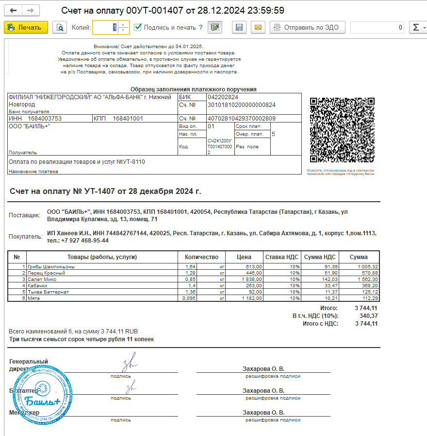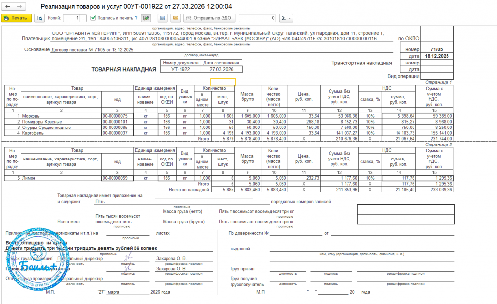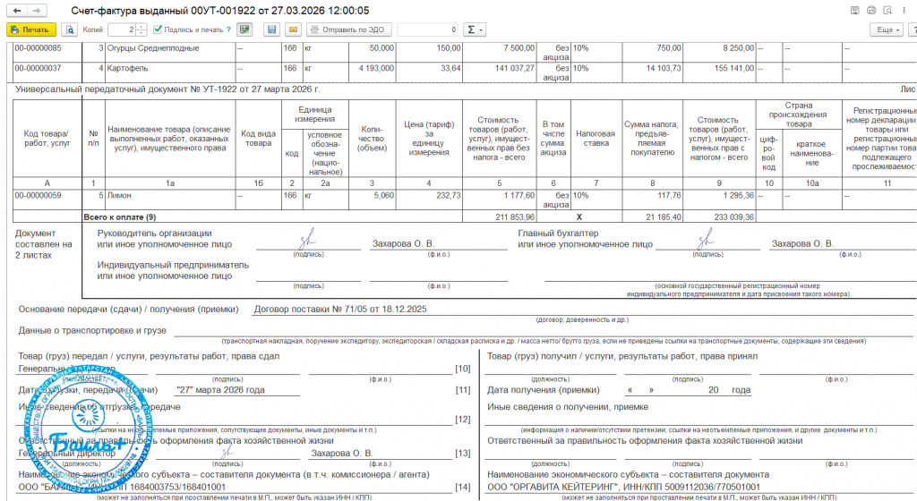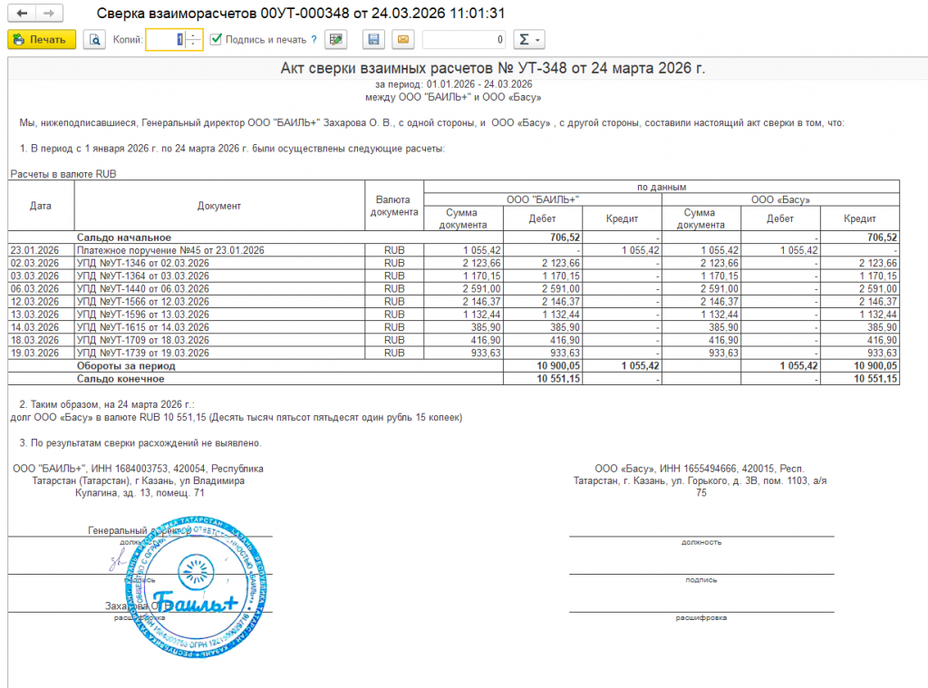 Подпись и печать в формах УПД, Счет-фактура, ТОРГ-12, Счет на оплату, Акт сверки взаиморасчетов УТ 11.5