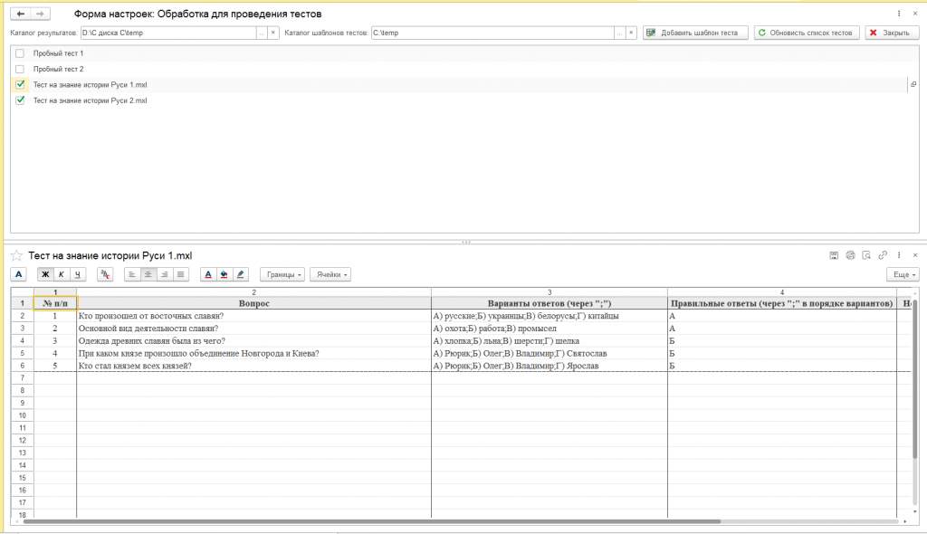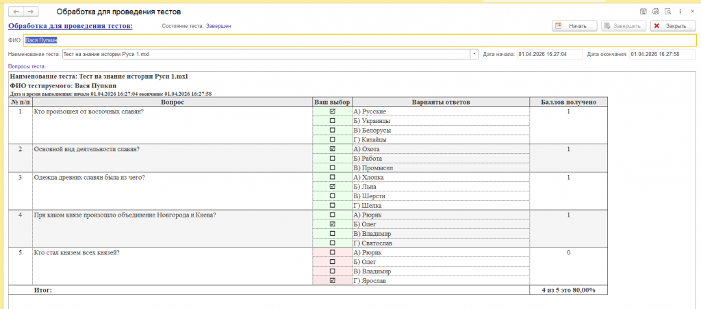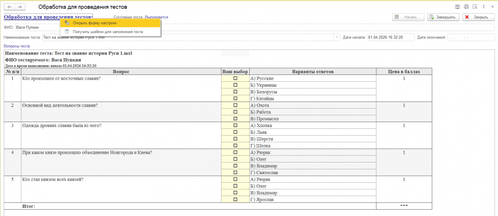 Внешняя обработка для проведения тестов сотрудников