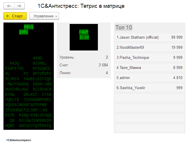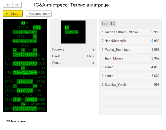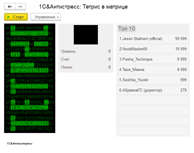 Единственная существенная трудность, с которой я столкнулся: 1С не позволяет интерактивно взаимодействовать с формой, пока выполняется код этой самой формы. Штатное средство (насколько я понимаю, если не изобретаю велосипед) только одно - подключение обработчиков ожидания. В принципе, вариант неплохой, но есть нюанс: повторяемый обработчик вызывается с шагом, кратным целой секунде. Это очень много, ни о какой комфортной игре речи нет. Неповторяемый можно вызвать через 0,1 секунды, то есть FPS будет равен 10. Тоже очень плохо.