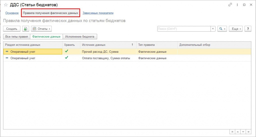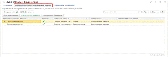 В статье бюджета перейдите на вкладку «Правила получения фактических данных». Добавьте хозяйственные операции, по которым нужно собирать факт. В примере настроены: «Прочий расход ДС» и «Оплата поставщику».