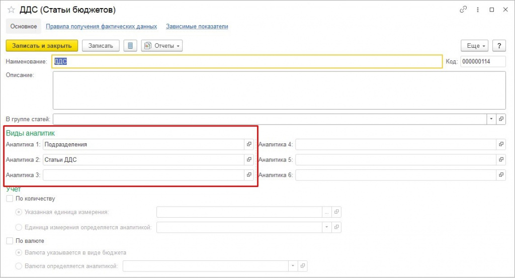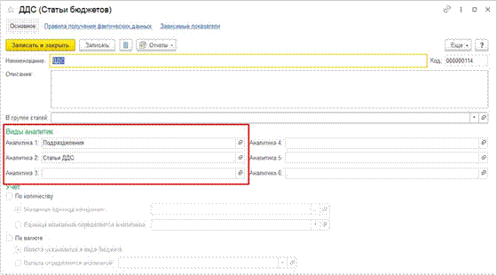 Откройте справочник «Статьи бюджетов» и создайте новую статью (или используйте существующую). Добавьте две аналитики: