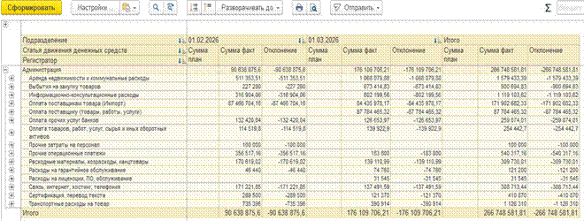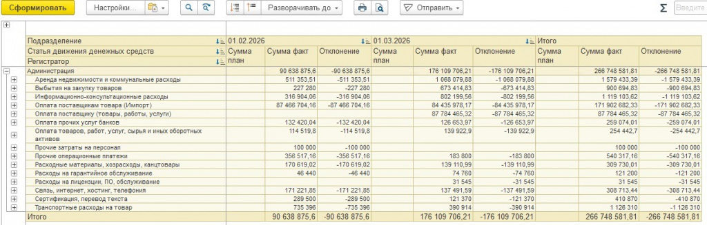 - План, факт и отклонение в одном окне. По каждой статье ДДС и подразделению видны сумма плана, сумма факта и отклонение. Перерасход заметен сразу.