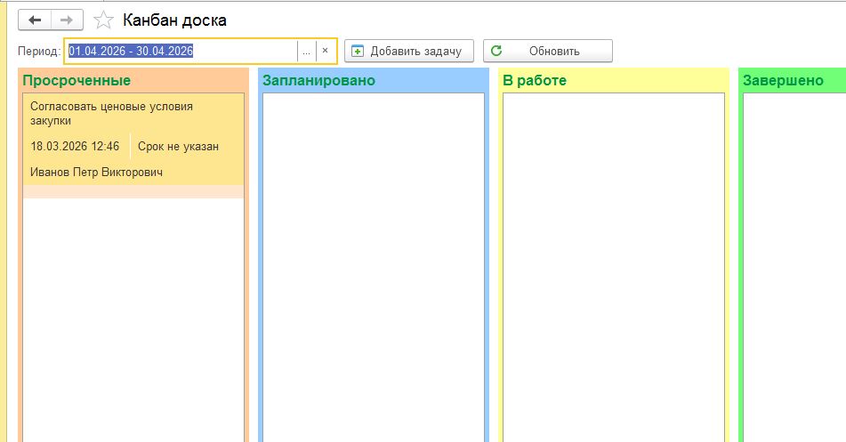 Доска Канбан для БП 3, один из примеров реализации, стадии можно менять в соответствующем справочнике с последующей возможностью перестроить порядок, а также добавить или удалить имеющиеся стадии на форме (колонки стадий формируются динамически).