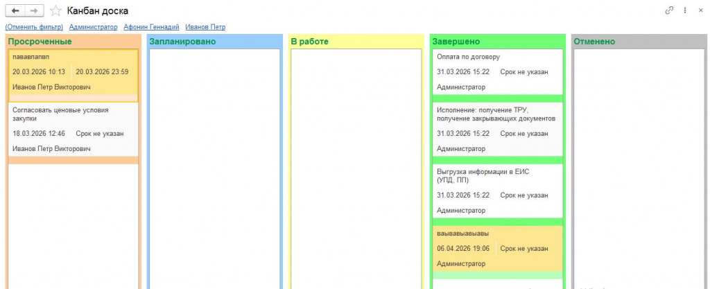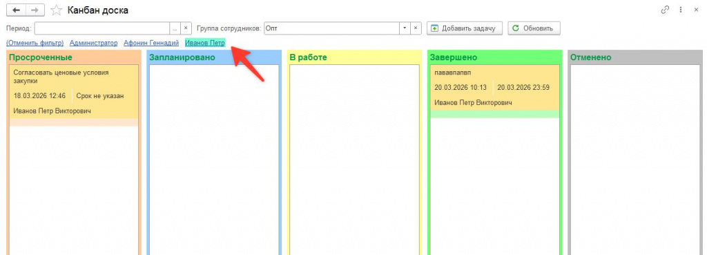 Канбан-доска задач сотрудников по состояниям, с групповым подходом и быстрым фильтром (для УТ 11, КА 2, ERP 2)