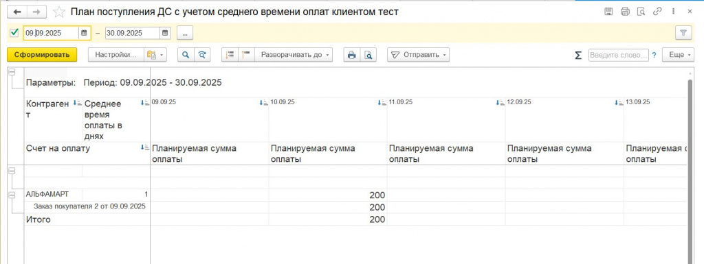 • Итого по дням (в подвале отчета): Сумма всех ожидаемых поступлений от всех контрагентов в разрезе конкретного дня.