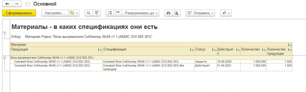 Отчёт "Материалы - в каких спецификациях они есть" показывает, в каких Спецификациях есть Выбранный материал.