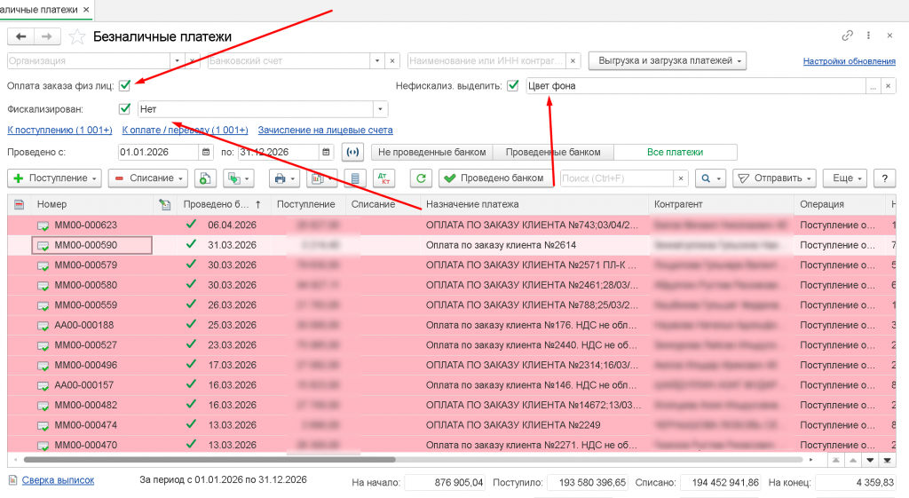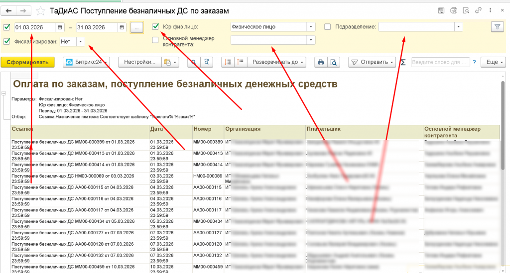 Именно поэтому сделан анализ работы в конфигурациях и последующая доработка типового функционала в расширение 1С, которое позволяет эффективно отслеживать поступления безналичных денежных средств по Заказам от физических лиц.