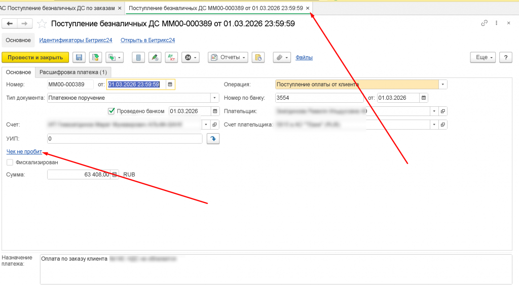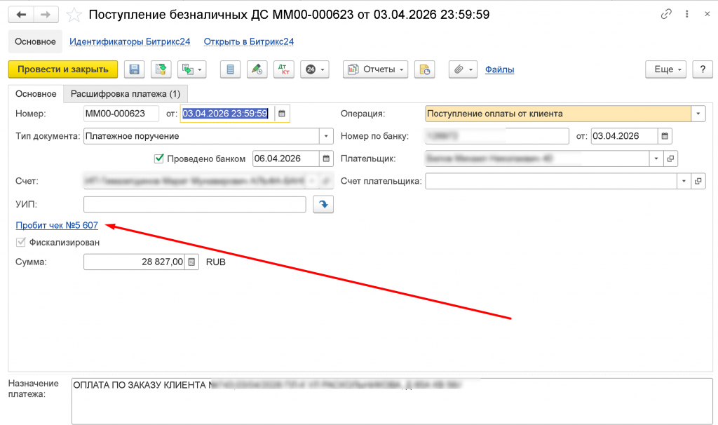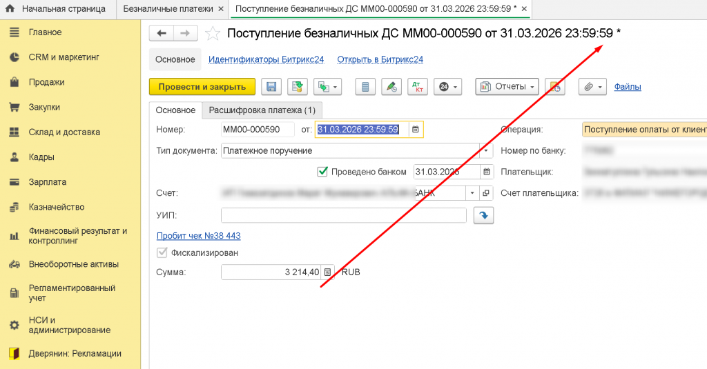 - Установка признака «Фискализирован» в документе «Поступление безналичных денежных средств» происходит программно, исходя из анализа содержимого документа, фискального статуса и другим условиям\регулярным выражениям. Сохранение признака «Фискализирован» происходит при Записи\Проведении документа, если он не был уже установлен.