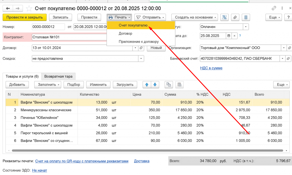 1. Продавец заполняет данные в документе "Счет покупателю".