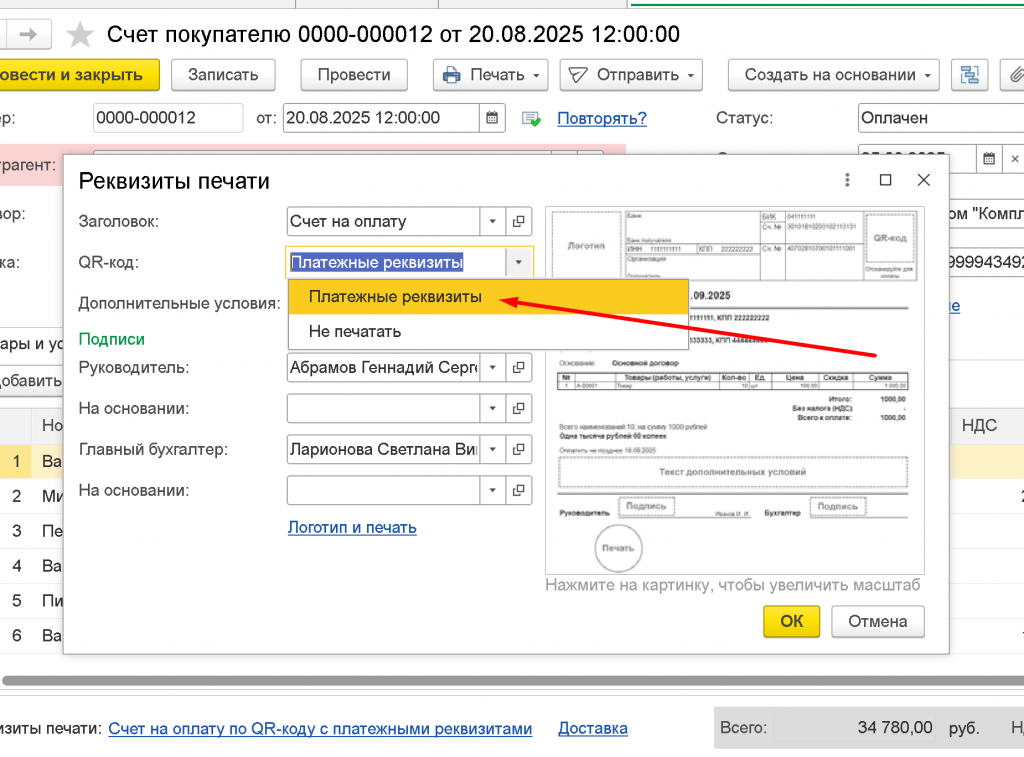 2. Внизу документа открывает «Реквизиты печати», выбирает напротив поля QR-код – «Платежные реквизиты», после выбора поле приобретает вид – «Счет на оплату по QR-коду с платежными реквизитами».