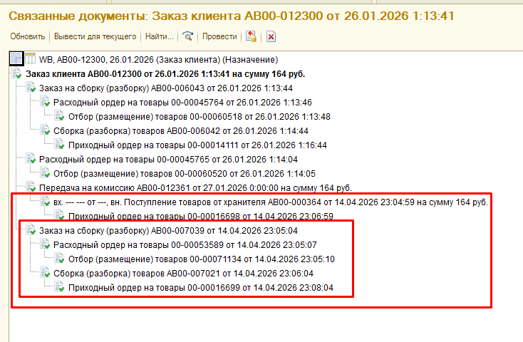 3 шаг: Если документ «Заказ на сборку» имеется в структуре «Заказ клиента», тогда формируем цепочку документов разбора. «Заказ на разбор» - «Расходный ордер» - «Документ отбора»-«Разборка» - «Приходный ордер» - «Размещение».