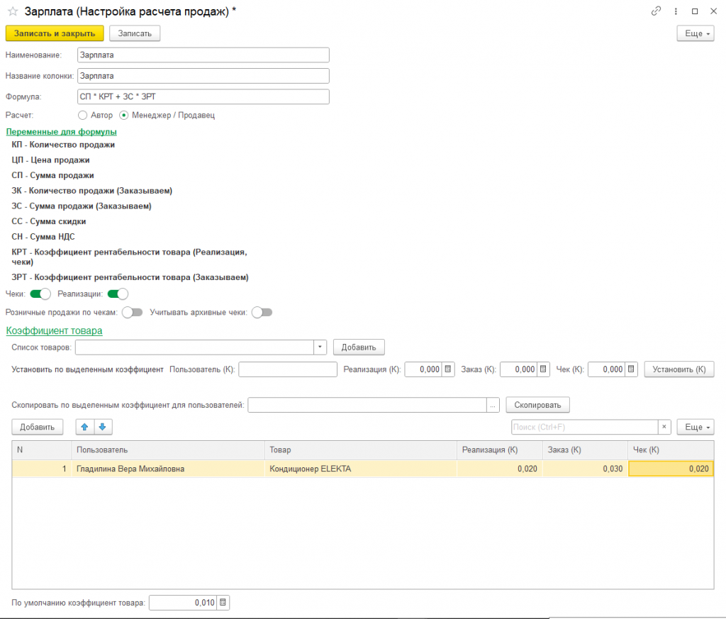 В таблицу коэффициенты товаров указываем коэффициенты для товаров (группа номенклатуры или номенклатура), возможно указать для разных пользователей разный коэффициент, если колонка пользователь не заполнена коэффициент действует для всех пользователей. Если для товара не указан коэффициент будет действовать коэффициент который заполнен в поле "по умолчанию коэффициент товара".