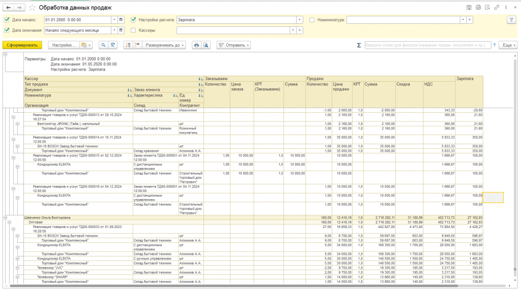 Отчет позволяющий анализировать эффективность продаж с настройками расчета, и колонка в отчете с результатом, который рассчитывается по заданной вами формуле. Отчет выводит полную картину розничных и оптовых продаж и заказываемого товара в разрезе документов и номенклатуры, в котором отображаются продажи, количество, цена, процент вознаграждения от продажи, сумма, скидка, сумма НДС и колонка с результатом по заданной формуле.