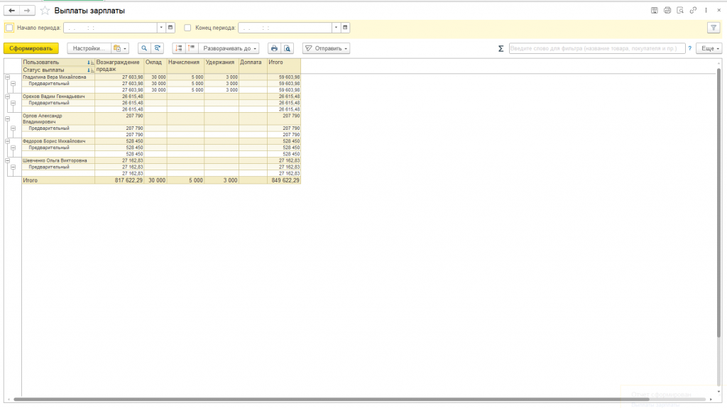 При нажатии на кнопку заполнить сформируется таблица с зарплатой сотрудникам.