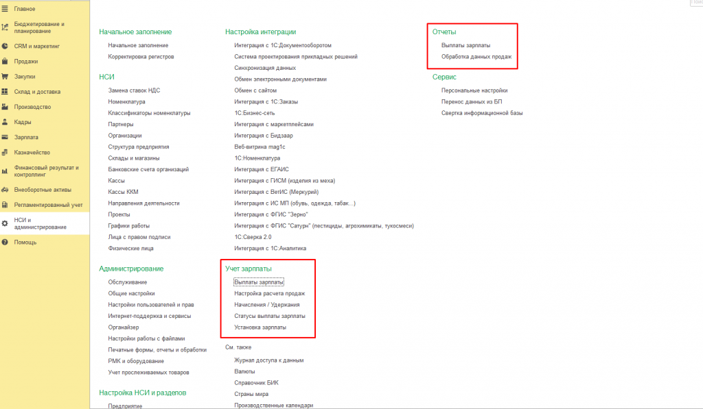 После добавления расширения в разделе "НСИ и администрирование" появится раздел "Учет зарплаты".