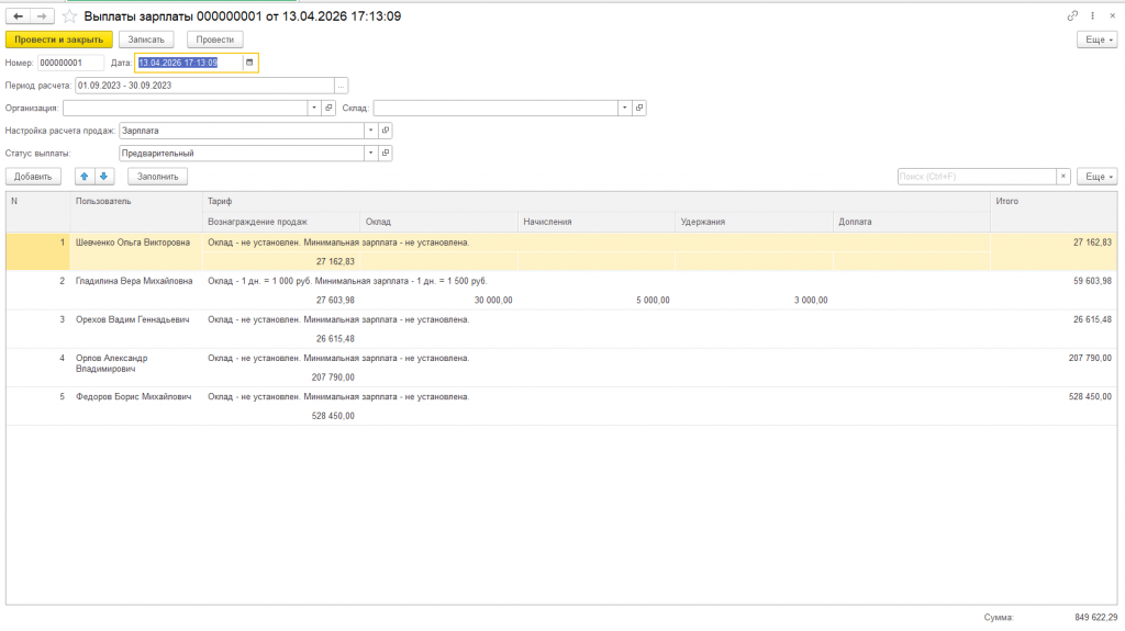 В документе формируется зарплата сотрудникам по заданным настройкам.